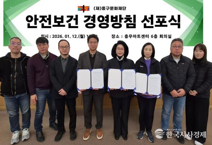 한국시사경제 노승선 기자 | 재단법인 중구문화재단이 지난 12일 충무아트센터 6층 회의실에서 ‘안전보건 경영방침 선포식’을 개최하고, 전 직원과 함께 안전한 근무환경 조성을 위한 경영 의지를 공유했다.