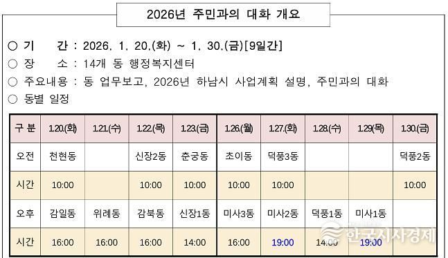 한국시사경제 기동취재팀 | 하남시는 오는 1월 20일부터 30일까지 관내 각 동 행정복지센터를 순회하며 ‘2026년 주민과의 대화’를 개최한다고 밝혔다.