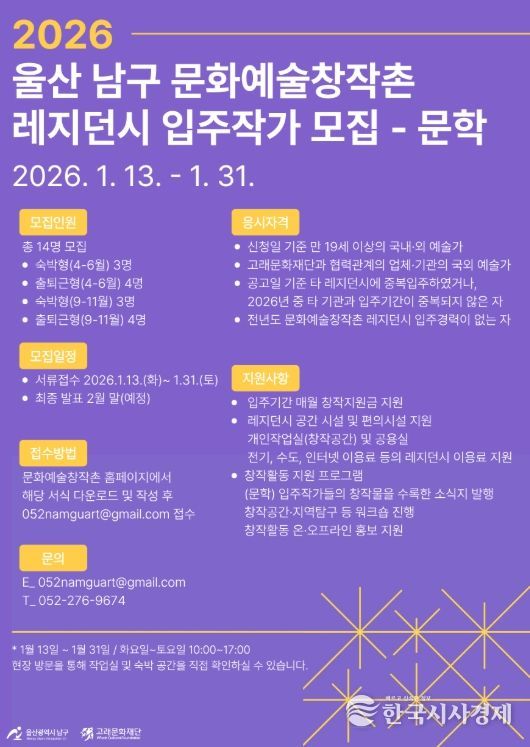 한국시사경제 울산취재본부 | 고래문화재단이 운영하는 울산 남구 문화예술창작촌이 2026년도 레지던시 사업에 참여할 입주작가를 1월 13일부터 1월 31일까지 공개 모집한다.