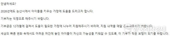 한국시사경제 김태훈 기자 | 논산의 새해를 매년 감동으로 물들인‘익명의 기부천사’가 올해도 어김없이 찾아왔다.