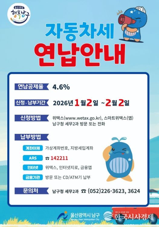 한국시사경제 울산취재본부 | 울산 남구는 오는 2월 2일까지 올해 1월 자동차세 연납 신청을 접수한다고 밝혔다.