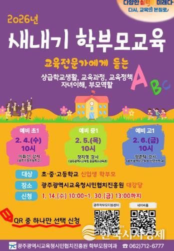 한국시사경제 광주취재본부 | 광주시교육청시민협치진흥원은 오는 2월 4~6일 본원 대강당에서 초·중·고등학교 신입생 학부모를 대상으로 ‘2026년 새내기 학부모교육’을 운영한다.