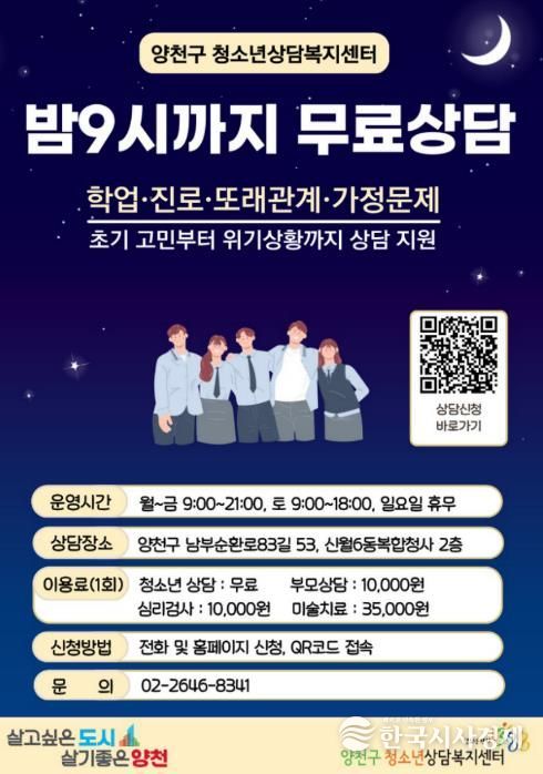 한국시사경제 기동취재팀 | 양천구가 심리적·정서적 어려움을 겪고 있는 청소년의 건강한 성장을 돕기 위해 마음건강 지원 강화에 나섰다. 올해부터 청소년상담복지센터 개인상담 서비스를 전면 무료화하고, 평일 밤 9시까지 연장 운영에 돌입한다.