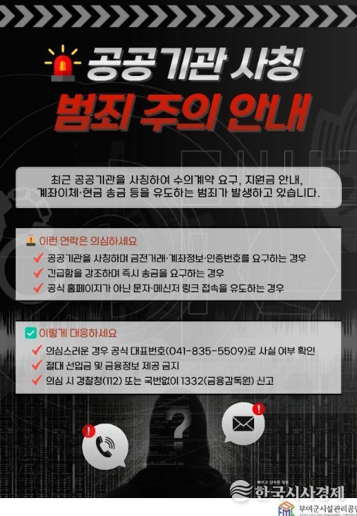 한국시사경제 김태훈 기자 | 부여군시설관리공단은 최근 공공기관을 사칭해 물품 대리구매나 수의계약을 가장하고 선입금을 요구하는 사기 시도가 발생하고 있다며, 관내 업체와 협력사를 대상으로 각별한 주의를 당부했다.