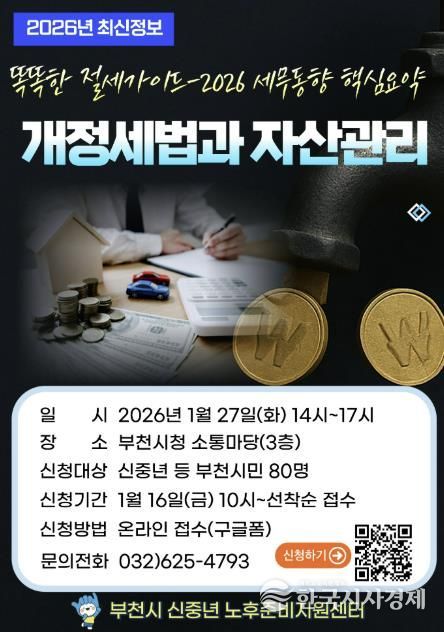 한국시사경제 경기취재본부 | 부천시는 1월 27일 시청 3층 소통마당에서 ‘2026년 개정세법과 자산관리’ 재무특강을 진행한다. 이번 특강은 오후 2시부터 5시까지 부천시민 80명을 대상으로 무료로 진행되며, 신중년의 자산관리 역량을 높이고 안정적인 노후설계를 지원하기 위해 마련됐다.