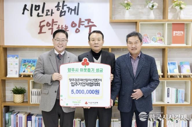 한국시사경제 경기북부취재본부 | 양주시가 지난 15일 시장실에서 양주검준패션칼라사업협동조합을 비롯한 관련 단체 및 기업으로부터 이웃돕기 성금과 성품을 기탁받았다고 밝혔다.