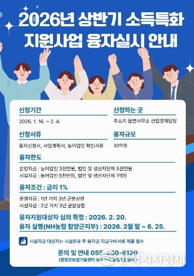 한국시사경제 경남취재본부 | 함양군은 농업인의 경영개선과 농업 경쟁력 강화를 위한 ‘2026년 상반기 소득특화지원사업’을 시행하고, 오는 2월 4일까지 융자신청을 받는다.