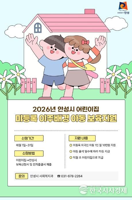 한국시사경제 경기취재본부 | 안성시는 2026년부터 어린이집에 다니는 미등록 외국인(이주배경) 영유아에게 월 10만원의 보육지원금을 지원한다고 밝혔다.