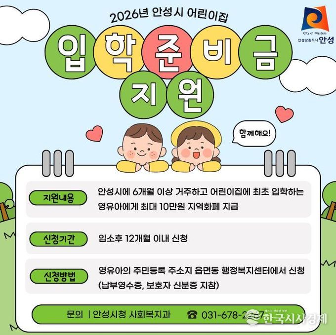 한국시사경제 경기취재본부 | 안성시는 2026년부터 어린이집 입학준비금 지원사업을 시행한다고 밝혔다.