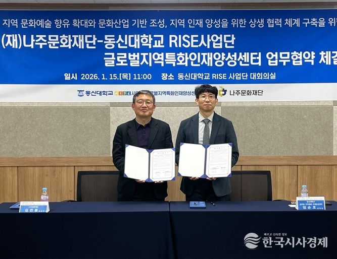 나주문화재단(이사장 윤병태)은 동신대학교 RISE사업단 글로벌지역특화인재양성센터(센터장 임순호)와 지난 15일 지역 문화예술 향유 확대와 문화산업 기반 조성, 청년 인재 양성을 위한 업무협약을 체결했다고 16일 밝혔다.