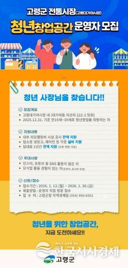 한국시사경제 경제팀 | 고령군은 이달 말 30일까지 고령대가야시장 내 청년창업공간에 신규 점포를 운영할 만19~39세 청년 창업가를 모집한다고 밝혔다.