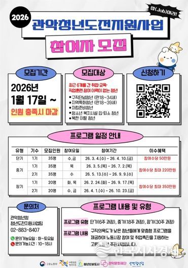 한국시사경제 이정이 기자 | 관악구가 구직을 단념한 청년들의 사회 진입을 돕기 위해 오는 1월 17일부터 ‘2026년 청년도전지원사업’ 참여자를 모집한다.