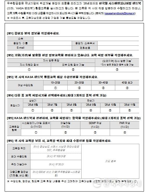 한국시사경제 디지털 뉴스팀 | 우주항공청은 위성개발 현장을 방문하는 한국형 시스템엔지니어링 핸드북(이하 ‘KASA 핸드북’) 활용 교육을 위한 수요조사를 1월 19일부터 실시한다.