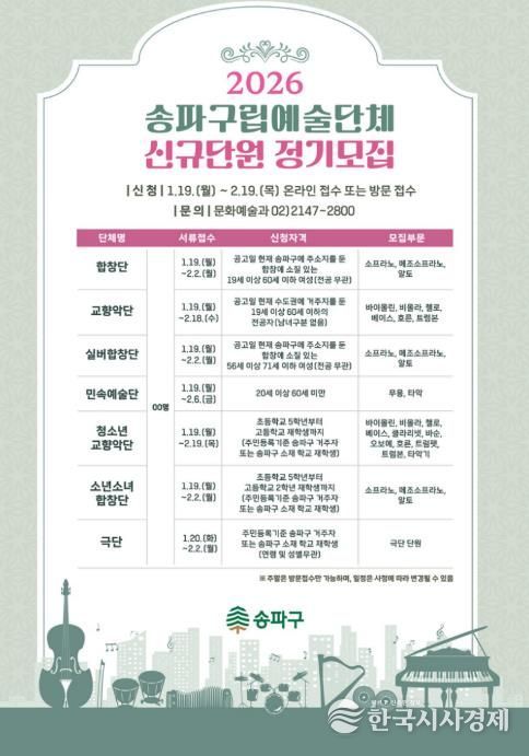 모집 기간은 단체별로 상이하며, 최대 2월 19일까지다. 입단을 희망하는 구민은 송파구청 홈페이지 고시·공고란에서 단체별 자격 조건과 모집 부문을 확인한 후, 응시 서류를 작성해 이메일로 제출하거나 송파구청 문화예술과로 방문 접수하면 된다.