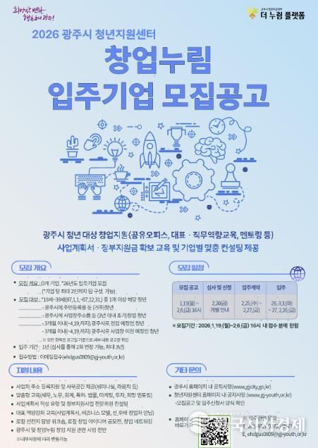 한국시사경제 기동취재팀 | 광주시는 지역 내 유망한 청년 창업가를 발굴하고 안정적인 창업 환경을 조성하기 위해 ‘2026년도 창업누림 신규 입주기업’을 공개 모집한다고 19일 밝혔다.