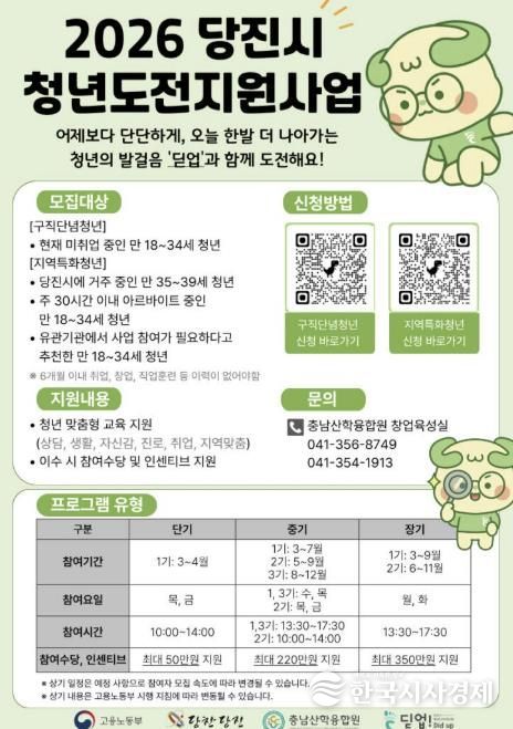 한국시사경제 충남취재본부 | 당진시는 고용노동부가 주관하는‘청년도전지원사업’에 올해에도 선정돼 연중 참여자를 모집한다고 20일 밝혔다.