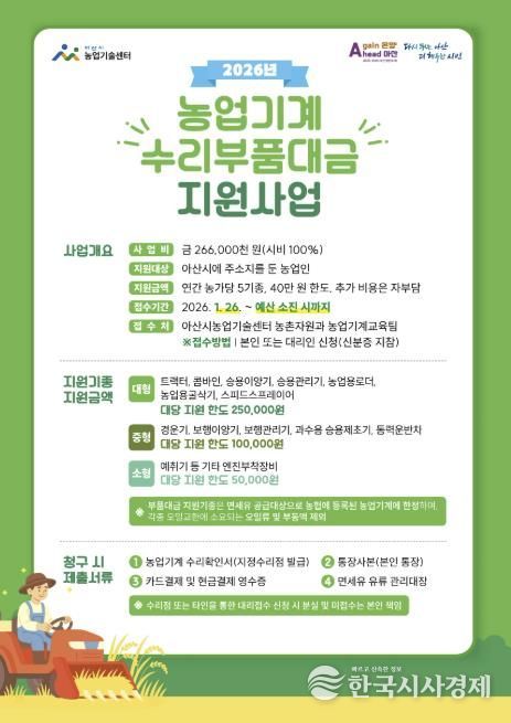 한국시사경제 충남취재본부 | 아산시농업기술센터는 농가 경영비 절감을 위해 ‘농업기계 수리부품대금 지원사업’을 오는 1월 26일부터 본격 시행한다.