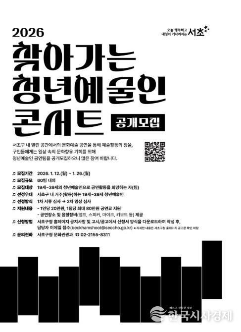 한국시사경제 이정이 기자 | 서울 서초구는 지역 내 일상 공간에서 자유롭게 끼와 역량을 펼칠 청년예술인 모집에 나선다고 밝혔다. 모집사업은 ‘찾아가는 청년예술인 콘서트’와 ‘서초 청년갤러리 사업’으로 각각 1월 26일(월), 2월 19일(목)까지 신청을 받는다.