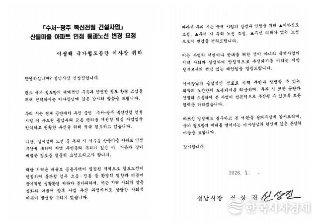 한국시사경제 경기취재본부 | 성남시는 지난 16일 김윤덕 국토교통부 장관과 이성해 국가철도공단 이사장에게 ‘수서~광주 복선전철(이하 수광선) 건설사업’과 관련하여 여수동 산들마을 아파트 인접 통과 구간의 노선 변경을 요청하는 서한을 전달했다고 20일 밝혔다.