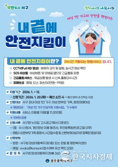 김민정 양성아동복지과장은 “안전지킴이 사업은 범죄에 대한 불안감을 낮추고 일상 속 심리적 안정감을 높여주는 실효성 있는 정책”이라며 “올해도 세밀하고 지속적인 주거안전 지원을 통해 안전 사각지대 없는 서구를 만들겠다”고 말했다.