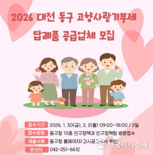 한국시사경제 대전취재본부 | 대전 동구는 이달 30일부터 다음 달 2일까지 주말을 제외한 이틀간, ‘2026년 고향사랑기부제 답례품 공급업체’를 추가 공개 모집한다고 20일 밝혔다.