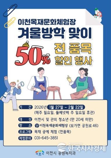 한국시사경제 이정이 기자 | 이천시는 겨울방학을 맞아 어린이 및 청소년들에게 특별한 체험 기회를 제공하기 위해 목재문화체험장 이용료를 50% 할인하는 행사를 진행한다고 밝혔다.