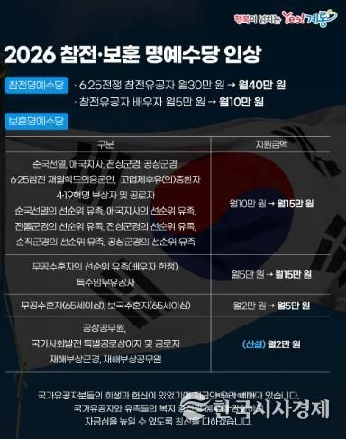 특히 2026년부터는 공상공무원, 국가사회발전 특별공로상이자 및 공로자, 재해부상군경, 재해부상공무원에게도 보훈명예수당을 신설해 월 2만 원을 지급할 예정이다.
