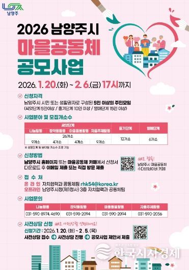 한국시사경제 경기북부취재본부 | 남양주시는 1월 20일부터 2월 6일까지 ‘2026년 마을공동체 공모사업’참여 공동체를 공개 모집한다.