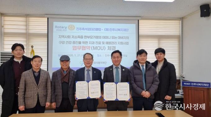 한국시사경제 윤광희 기자 | 진주시복지재단은 21일 진주시복지재단에서 국제로타리 3590지구 진주촉석로타리클럽과 저소득 한부모 가정의 구강 건강 증진을 위한 업무협약(MOU)을 체결했다.