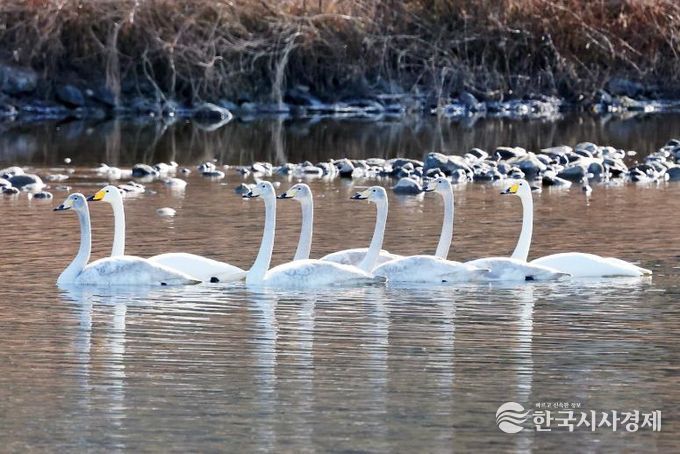 한국시사경제 충북취재본부 | 충북 괴산 달천강에 내려앉은 ‘겨울 진객’… 큰고니 가족의 평화로운 외출청정 괴산의 생태 지표로 주목영하권 추위가 몰아친 충북 괴산군 달천강변에 반가운 손님이 찾아왔다.