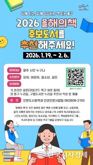 한국시사경제 광주취재본부 | 광주 동구는 한 해 동안 시민과 함께 읽을 2026년 ‘책 읽는 동구 올해의 책’ 선정을 위해 후보 도서 추천을 오는 2월 6일까지 접수한다고 밝혔다.