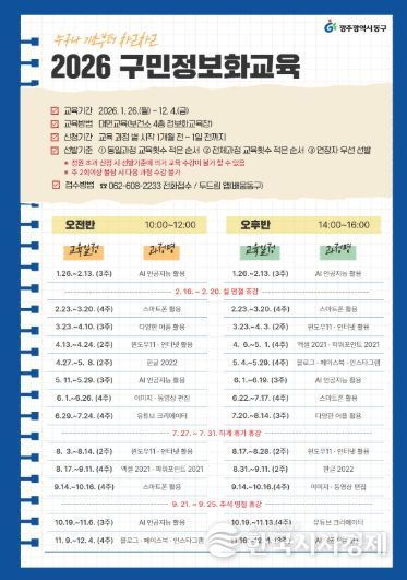 한국시사경제 광주취재본부 | 광주 동구는 생활 속 디지털 활용 능력을 높여 주민들의 삶의 질을 향상시키기 위해 주민 맞춤형 정보화 교육인 ‘구민 정보화 교실’을 이달 26일부터 연중 운영한다고 밝혔다.