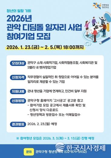 한국시사경제 이정이 기자 | 관악구가 전례 없는 취업 한파 속 청년층 고용의 버팀목이 되어줄 ‘2026년 관악 디딤돌 일자리 사업’ 참여기업을 모집한다.