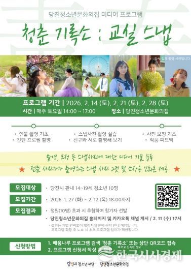 한국시사경제 충남취재본부 | (재)당진시청소년재단 당진청소년문화의집(관장 유수민)은 오는 2월 14일부터 28일까지 매주 토요일, 14시부터 17시까지 관내 14~19세 청소년을 대상으로 미디어 프로그램 [청춘 기록소 : 교실 스냅]을 운영할 예정이다.