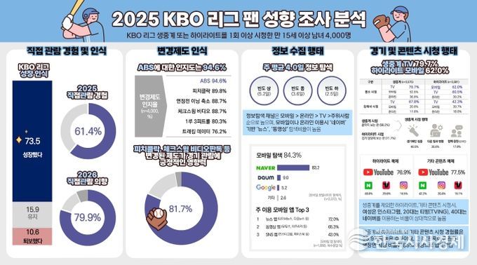 한국시사경제 스포츠팀 | KBO는 2025 KBO 리그에 대한 팬 인식과 소비 행태를 분석하기 위해 전문 조사업체인 ㈜글로벌리서치를 통해 온라인 팬 성향 조사를 실시했다. 본 조사는 KBO 리그 생중계 또는 하이라이트를 1회 이상 시청한 만 15세 이상 남녀 4,000명을 대상으로 진행됐다.