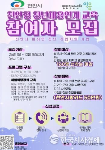 한국시사경제 충남취재본부 | 천안시는 ‘2026년 천안형 청년 채용연계 프로그램’ 참여자 160명을 선착순 모집한다고 27일 밝혔다.