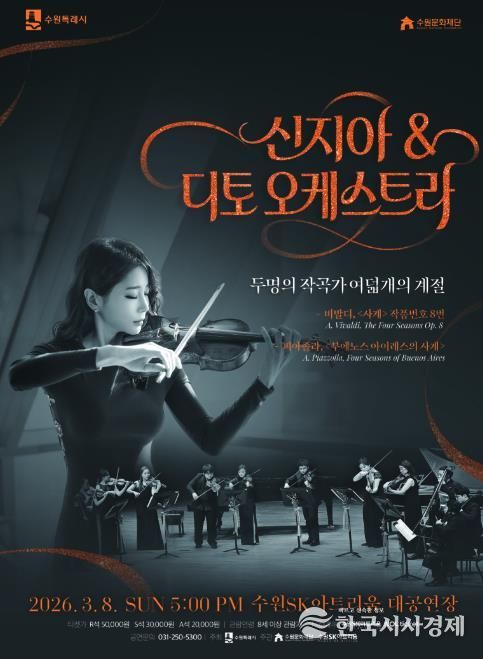 수원문화재단은 비발디와 피아졸라의 명작 ‘사계’를 한 무대에서 만나는 '신지아&디토오케스트라'를 오는 3월 8일 일요일 오후 5시 수원SK아트리움에서 개최한다.