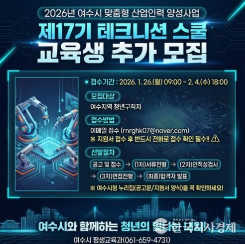 한국시사경제 전남취재본부 | 여수시가 지역 산업 수요에 맞는 전문 인력을 양성하기 위해 추진하는 ‘2026년 여수시 맞춤형 산업인력 양성사업’의 일환인 '테크니션 스쿨 제17기' 교육생을 추가 모집한다고 밝혔다.
