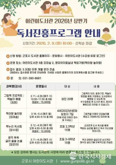한국시사경제 사회팀 | 군포시 어린이도서관은 오는 3월부터 새학기를 맞은 어린이들이 책 읽기의 즐거움과 성취감을 느끼고 꾸준한 독서활동으로 기초 학력을 향상시킬 수 있도록 2026년 봄학기 독서 진흥프로그램을 운영한다고 밝혔다.
