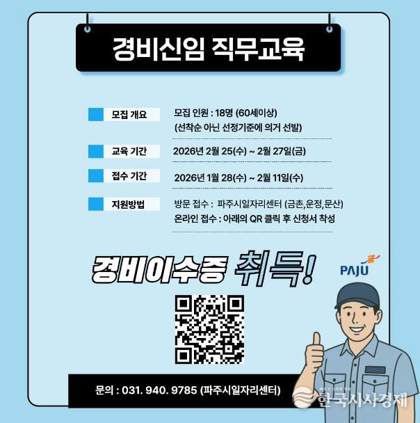 한국시사경제 경기북부취재본부 | 파주시는 경비 분야 취업을 희망하는 시민을 대상으로 ‘경비 신임 직무교육’참여자 18명을 모집한다.