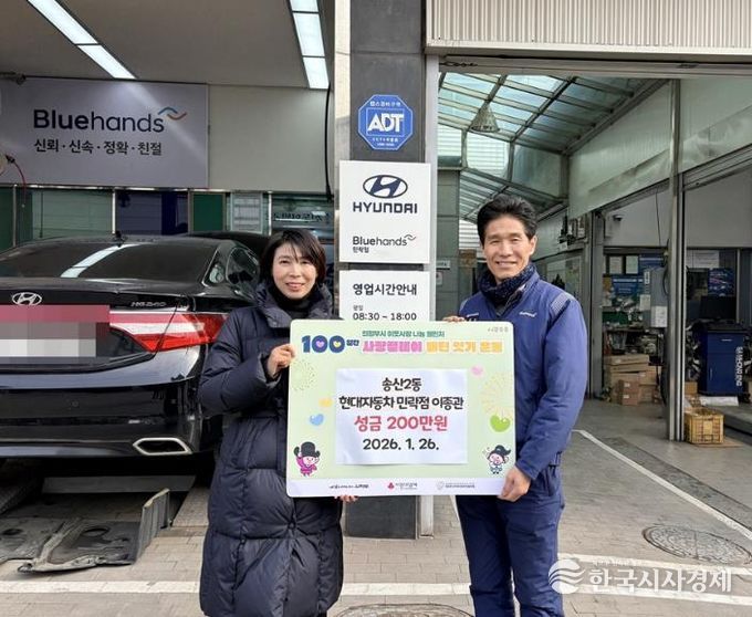 한국시사경제 경기북부취재본부 | 의정부시 송산2동주민센터는 1월 26일 현대자동차 블루핸즈 민락점 이종관 대표가 성금 200만 원을 기탁하며 이웃사랑을 실천했다고 밝혔다.