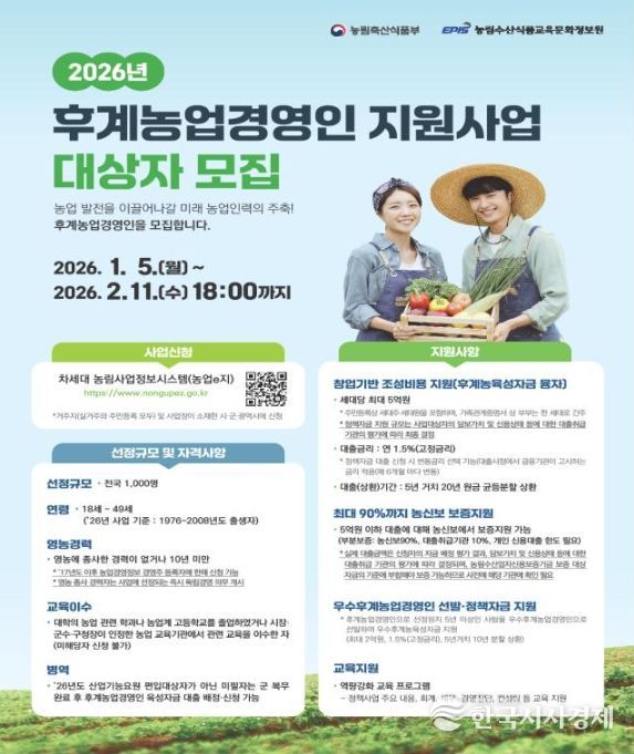 한국시사경제 노승선 기자 | 제주시는 농촌 고령화를 해소하고, 미래 농업인력을 육성하기 위해 ‘2026년 후계농업경영인 지원사업’ 대상자를 2월 11일까지 모집한다.