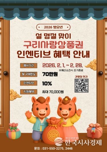 한국시사경제 경기북부취재본부 | 구리시는 설 명절을 맞아 지역 내 소비 촉진과 소상공인 매출 증대를 위해 2월 한 달간 구리사랑상품권 특별 인센티브를 10%로 확대 지원한다고 밝혔다. 이번 특별 인센티브는 1인당 월 구매 한도 70만 원까지 적용되며, 예산 소진 시 조기 종료될 수 있다.