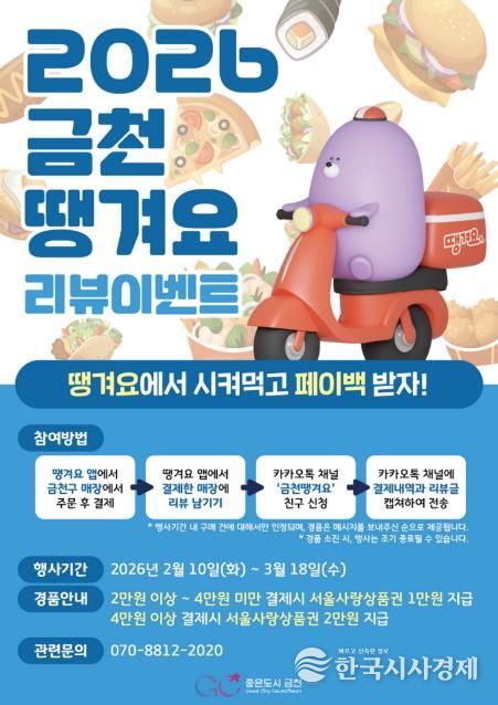 유성훈 금천구청장은 “설 명절을 앞두고 위축된 소비를 회복하고 지역 상권에 활력을 불어넣기 위해 공공배달앱과 금천땡겨요상품권을 연계한 지원책을 마련했다”라며, “주민들이 체감할 수 있는 혜택을 통해 지역 경제에 실질적인 도움이 되는 정책을 지속적으로 추진하겠다”라고 말했다.