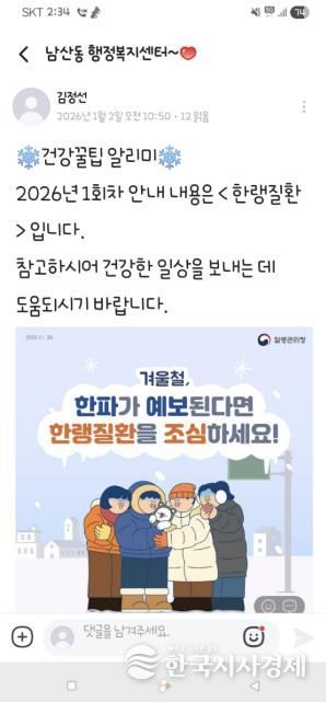 한국시사경제 부산취재본부 | 부산 금정구 남산동은 주민들의 생활 속 건강 관리 역량을 높이고 건강한 마을 공동체를 만들기 위한 건강 분야 특화사업 '건강 꿀팁 알리미'를 2026년에도 지속적으로 운영한다고 밝혔다.