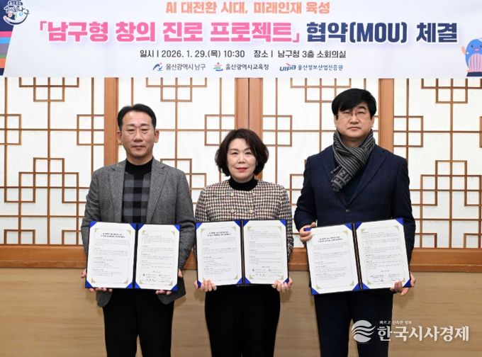 한국시사경제 울산취재본부 | 울산 남구는 AI 대전환 시대를 맞아 미래 사회를 이끌 창의융합형 인재 양성을 목표로 ‘남구형 창의 진로 프로젝트’ 운영을 위한 업무협약을 29일 체결하고 지역 기반 미래교육 협력체계 구축에 본격 나선다.