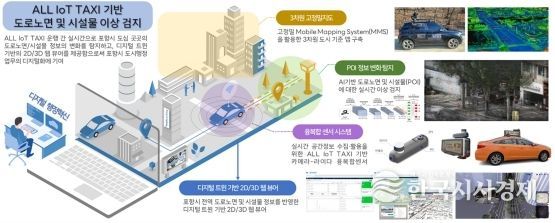 교통량이 많은 택시와 관용차량 지붕에 IoT 센서와 카메라를 설치해, 차량이 도로를 주행하는 과정에서 포트홀(도로 파임), 차선 훼손, 불법 적치물, 어린이보호구역 내 불법 주정차 등을 자동으로 감지한다.