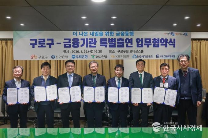 한국시사경제 기동취재팀 | 구로구가 1월 29일 구청 3층 르네상스홀에서 신한은행, 우리은행, 하나은행, 국민은행, 새마을금고, 서울신용보증재단과 ‘더 나은 내일을 위한 금융동행’ 특별출연 협약을 체결하고, 총 212억 5천만 원 규모의 중소기업·소상공인 특례보증을 추진한다.
