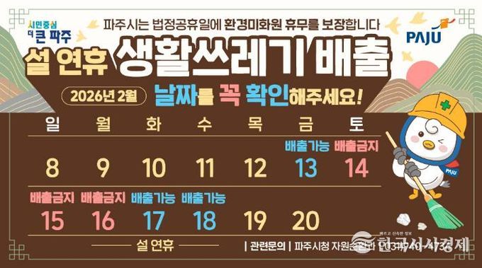 한국시사경제 경기북부취재본부 | 파주시는 2026년 설 연휴 기간 동안 환경미화원의 휴무를 보장하고 안정적인 생활 쓰레기 수거체계를 운영하기 위해 일부 기간 생활 쓰레기 수거를 중단한다.