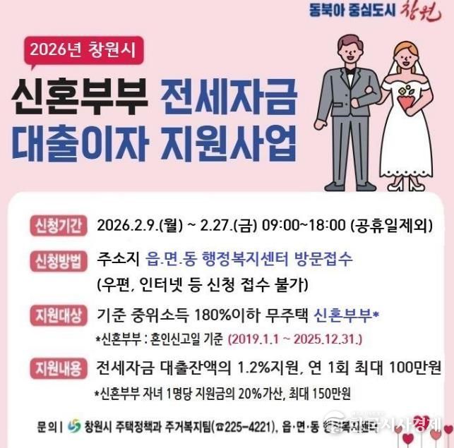 한국시사경제 노승선 기자 | 창원특례시는 신혼부부의 안정적인 주거환경 조성을 위해 “2026년 창원시 신혼부부 전세자금 대출이자 지원사업”을 시행한다고 밝혔다.